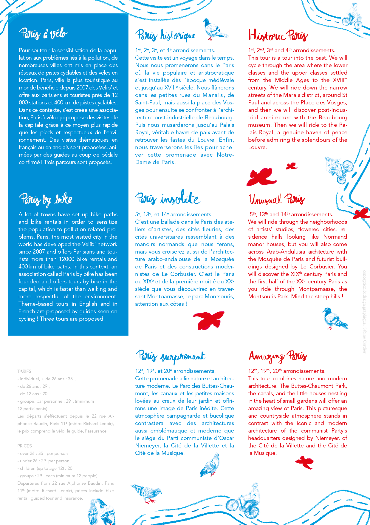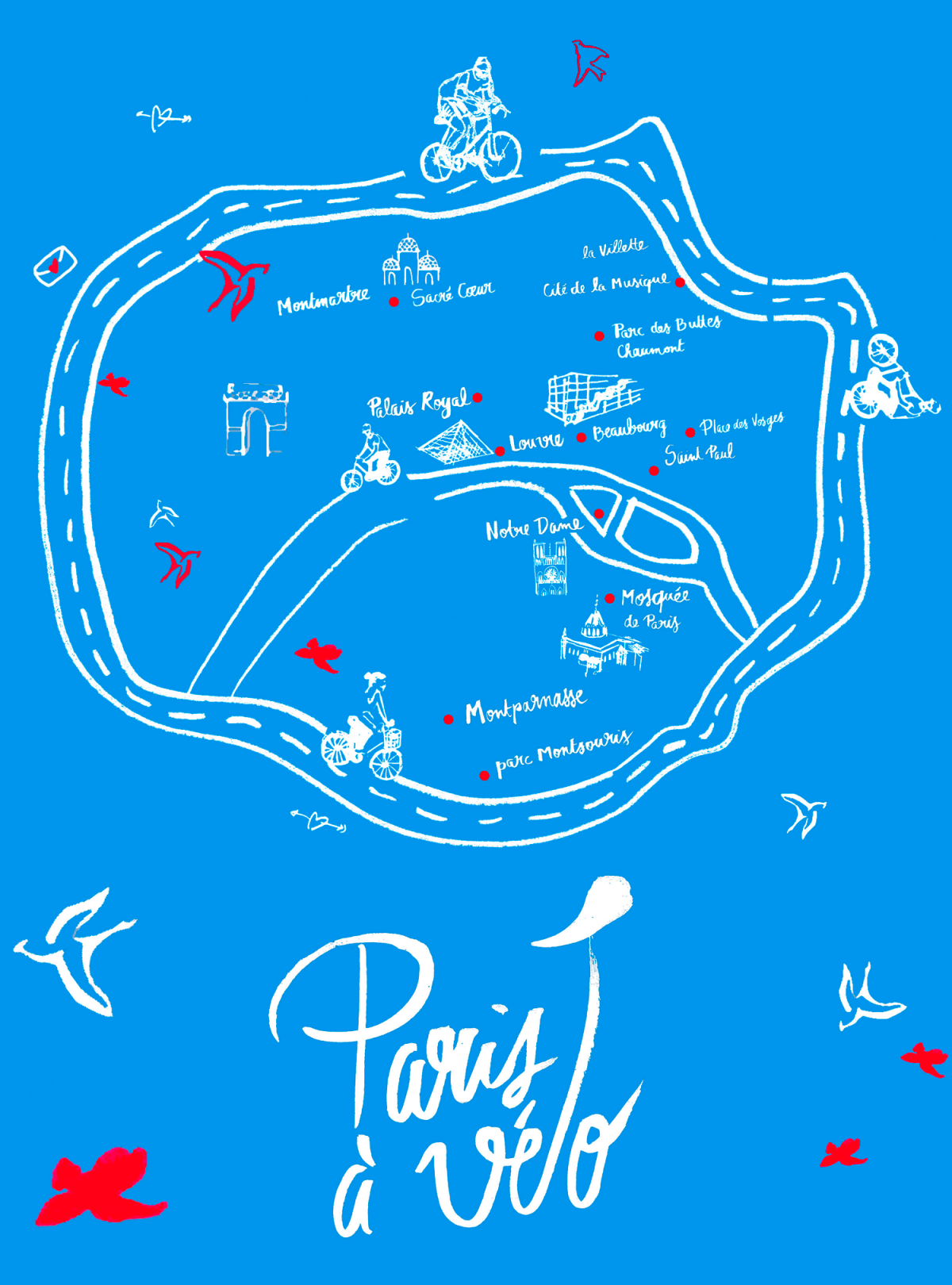 Creation of the entire program: logo, typography and illustrations for the association Paris by bike. The idea was to put forward a bike ride that stands out from the usual tourist routes, with a friendly aspect.